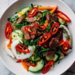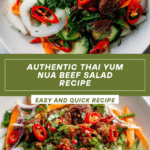 Yum Nua, or Authentic Thai Beef Salad, is a vibrant, tangy, and spicy salad featuring grilled beef tossed with fresh vegetables and a zesty dressing made from lime juice, fish sauce, and palm sugar. This refreshing dish perfectly balances savory, sweet, and sour flavors and is an ideal light meal or appetizer.